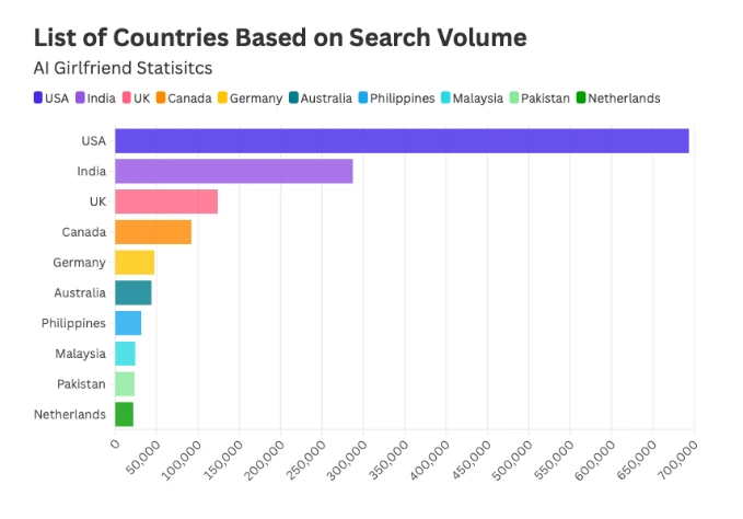 AI dating is most popular in the US, India, the UK, Canada, and Australia. These markets have higher digital maturity and less stigma around paid virtual companionship. But other regions are catching up — parts of Europe, Latin America, and, of course, Asia. Japan and South Korea, in particular, show consistently high demand for emotional AI companions.