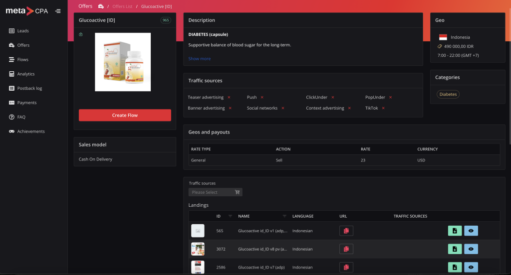MetaCPA gives instant access to around 700 offers, with the full catalog reaching over 1000. New landers and GEOs appear daily, including both standard affiliate offers and exclusive in-house products.